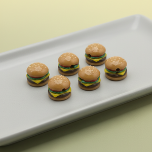 This itty cheeseburger is stacked with charm—layered buns, teeny toppings, and maximum personality. The most stylish burger you’ll ever wear.